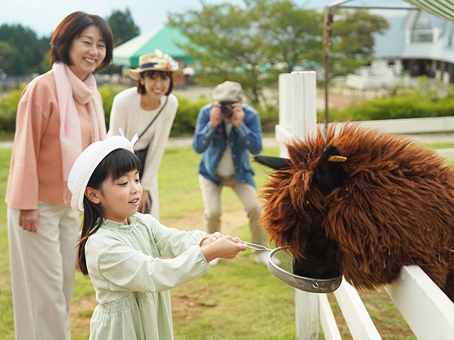 広い牧草地に放牧されているよ。おやつをあげて触れ合ってね。